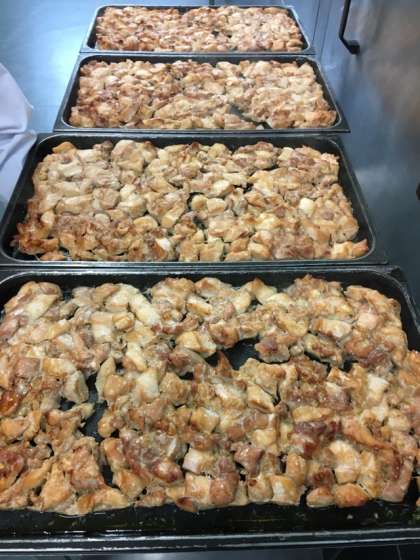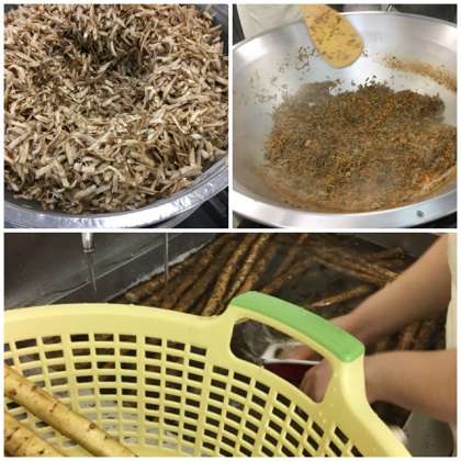 しょうゆバター焼きは、料理酒、こい口しょうゆで下味をつけた鶏肉に、溶かしバターをかけ、風味よくオーブンで焼きます。きんぴらごぼうは甘辛い味付けで、ごはんにとてもよく合う、子供達に人気の献立です。