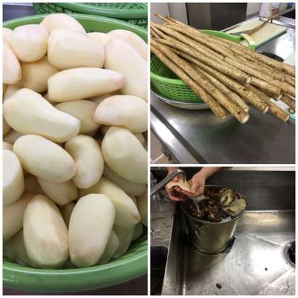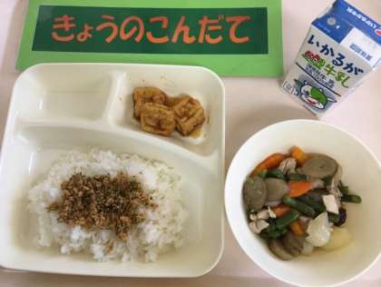 煮ものは、鶏肉、じゃがいも、玉ねぎ、ごぼう等の野菜、干ししいたけを使用しています。また、さけフレークに、いりごま、青のりなどを混ぜ合わせたふりかけをご飯にかけていただきます。和食献立も子供たちに大好評でした。