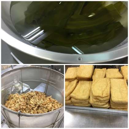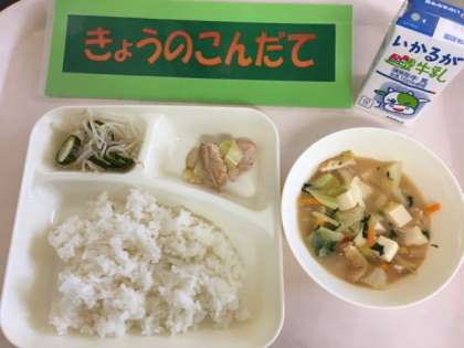 今日の給食は「焼きとり、みそ汁、きゅうりともやしのゆずの香あえ、ごはん」です。