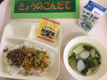 今日の給食は「ビビンバ、トック、いり黒豆」です。