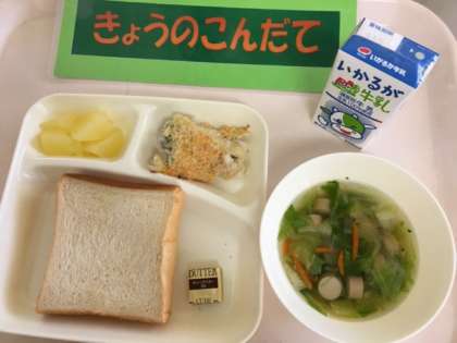 今日の給食は「マカロニグラタン、レタスのスープ、りんご缶、食パン、バター」です。