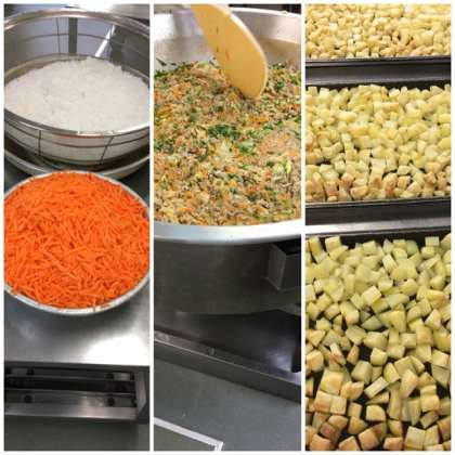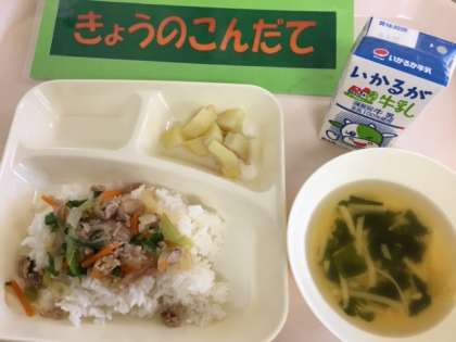 今日の給食は「豚丼、ゆばのすまし汁、焼きじゃが」です。豚丼は、豚肉を主材に糸こんにゃく、玉ねぎ、人参、青ねぎを使用し甘辛く煮た具をご飯にかけていただきます。また大豆から作られたゆばを使用したすまし汁はあっさりとした汁物です。どちらも食べやすくあっと言う間に完食してくれました。