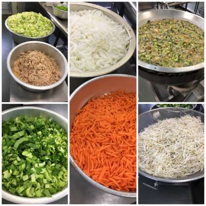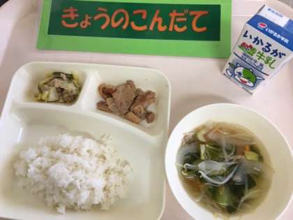 今日の給食は「鶏肉のオイスターソース焼き、中華スープ、ツナと野菜のごまいため、ごはん」です。