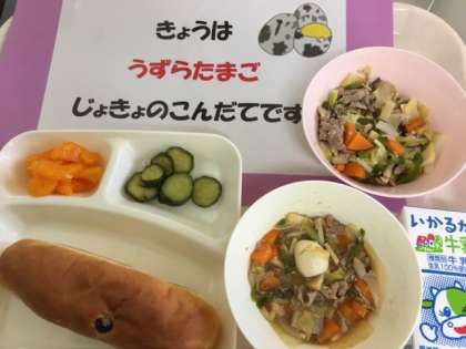 八宝菜は中国料理の1つで、八宝とはたくさんの宝のような材料という意味があることから、多くの種類の食材を使ったいます。この献立は「うずら卵」の個別対応献立です。