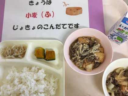 今日の給食は「すき焼き煮、焼きかぼちゃの甘みつかけ、もやしのごま酢あえ、ごはん」です。