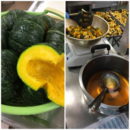 またかぼちゃの甘みつかけは、オーブンで焼いたかぼちゃに、手作りの甘いみつをかけています。おかずとして食べるのか、デザートとして食べるのか意見が分かれていましたよ。