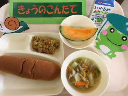 今日の給食は「カレードリア、スープ、クインシーメロン、黒糖パン」です。