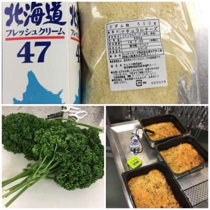 カレードリアは、鶏肉、玉ねぎをいため、米と合わせて煮、バットに入れてオーブンで焼きます。クリームでコクと滑らかさを出した、子供達に大人気の献立です。
