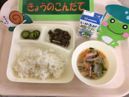 今日の給食は「チンジャオニューロウスー、ハムと野菜の中華スープ、きゅうりの辛みづけ、ごはん」です。