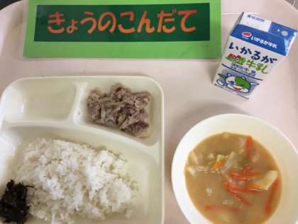 今日の給食は「豚肉のゆずの香焼き、みそ汁、のりのつくだ煮、ごはん」です。