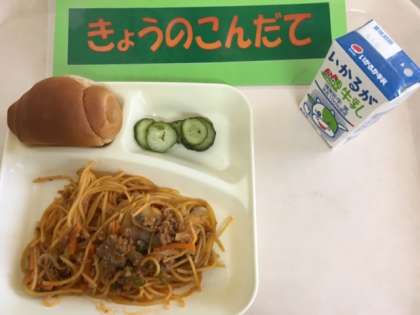 今日の給食は「スパゲティミートソース、きゅうりのバジル風味サラダ、黒糖パン」です。