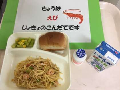 今日の給食は「シーフードトマトスパゲティ、グリーンアスパラガスのサラダ、はっ酵乳、1/2黒糖パン」です。
