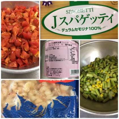 シーフードトマトスパゲティは、オリーブ油でにんにくを炒めて風味をつけ、ベーコンで旨味を増しています。えびとツナを主材にし、さらに夏を感じさせる生のトマトの酸味を生かした麺献立です。この献立は、【えび】の個別対応献立です。