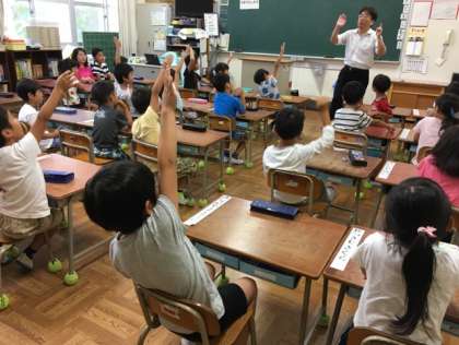 今日は、1年生と2年生の栄養教室の日でした。他校から栄養士の先生が食にまつわる授業をして下さいます。めあては、「食べ物の名前を覚えよう」「なんでも食べよう」です。給食で登場するたくさんの食材を紹介されながら子供達は楽しそうにお話を聞いていました。