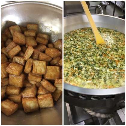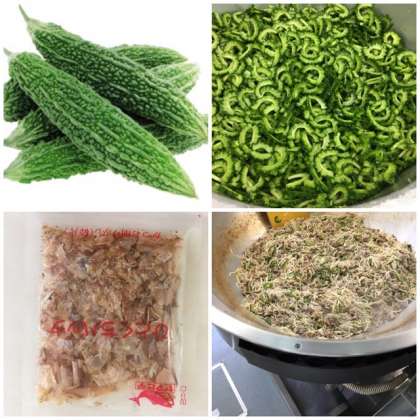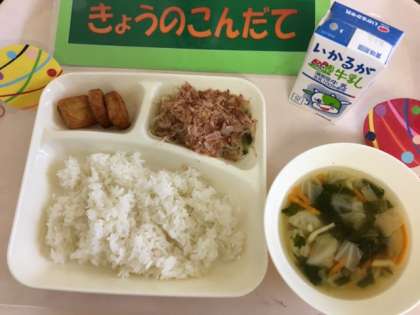 今日の給食は「ゴーヤチャンプルー、すまし汁、あつあげのみそだれかけ、ごはん」です。にがうり(ゴーヤ)は年に一度だけ給食に登場する夏野菜です。ビタミンCが多く含まれ、苦味成分は、食欲を増す働きがあります。食べる前に小袋のかつおぶしをかけることで、風味と旨味を感じることができます。