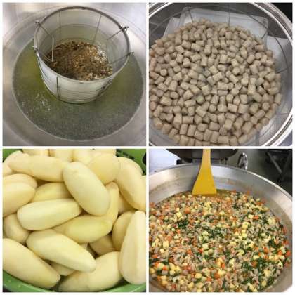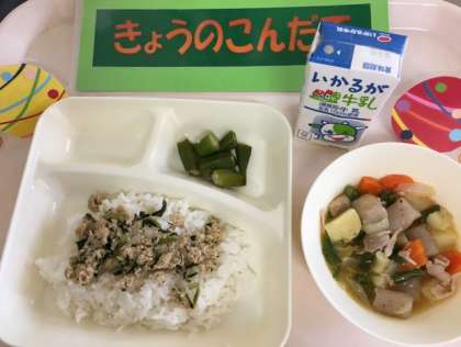 今日の給食は「豚肉とじゃがいもの煮もの、オクラの梅風味、ツナっ葉いため、ごはん」です。煮ものは、豚肉とじゃがいもを主材にして、つなこんにゃく、玉ねぎ、にんじん、青みに三度豆を使用した煮ものです。
