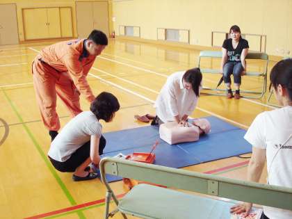 今年も、教職員・PTAがタイアップして、救命講習会を開きました。天王寺消防署の救急隊員の方々が来てくださり、蘇生法を中心に実習しました。PTAの方々13名の参加、総勢37名で、笑いの中にも厳しさを忘れず、あってはならない不測の事態に対応するため、一生懸命研修できました。
