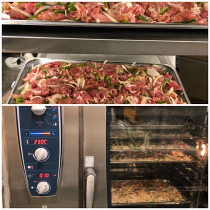 甘辛焼きは、豚肉、玉ねぎ、ピーマンに砂糖、塩、こい口しょうゆで下味をつけ、オーブンで焼き上げます。