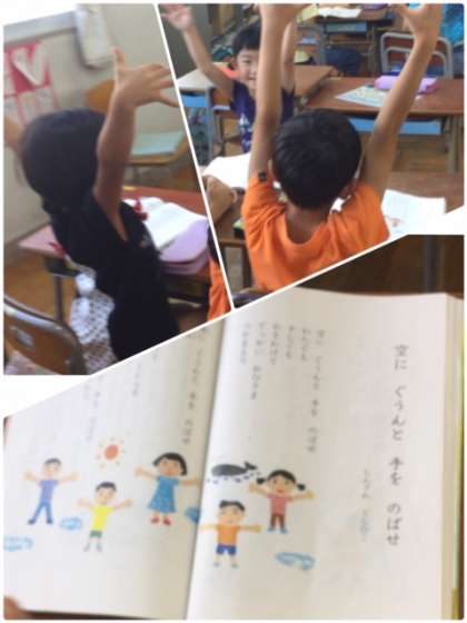 教室をのぞいたとき、みんなが「ぐうんと」をしていました。