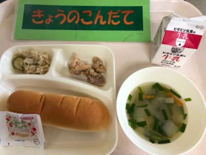 今日の給食は「鶏肉のからあげ、とうがんの中華スープ、切り干し大根の辛味づけ、コッペパン、りんごジャム」です。