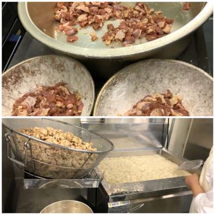 からあげは、しょうが汁、ニンニク、塩コショウで下味をつけた鶏肉にでんぷんをまぶし、カラッと揚げます。