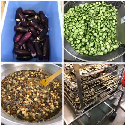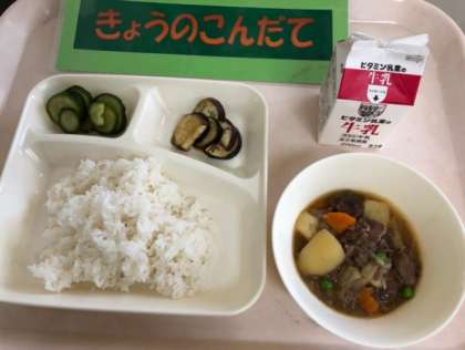 今日の給食は「肉じゃが、焼きなすのみそだれかけ、あっさりきゅうり、ごはん」です。