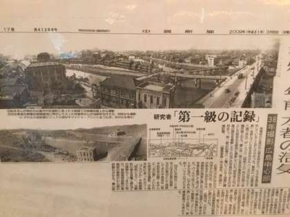 「この写真にも、昔の相生旅館、その隣に相生食堂が写っています。原爆投下の目標になったTの字の相生橋の平和公園の方に伸びている橋のたもと、そこに二軒並んで建っていました(写真中央)」「ひとたまりもありませんでした」