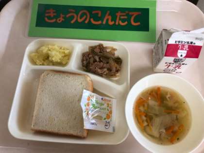 今日の給食は「豚肉と野菜のケチャップ風味焼き、スープ、スイートポテト、食パン」です。