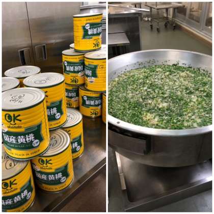 今日の給食は「ピリ辛丼、中華スープ、黄桃缶詰」です。