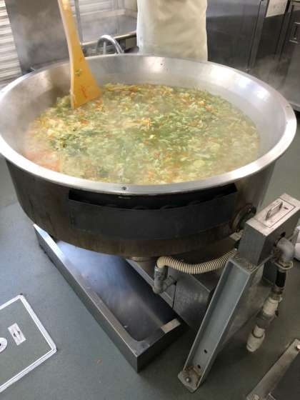 今日の給食は「なすのミートグラタン、鶏肉と野菜のスープ、みかん、黒糖パン」です。