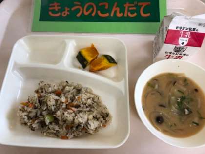今日の給食は「もずくと豚ひき肉のジューシー、みそ汁、焼きかぼちゃの甘みつかけ」です。