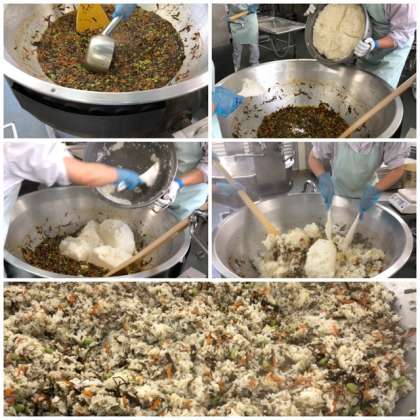 ジューシーは、沖縄風の混ぜごはんのことです。もずくと豚ひき肉の他に、切り昆布が入っています。給食のもずくは、オキナワモズグを使用しています。