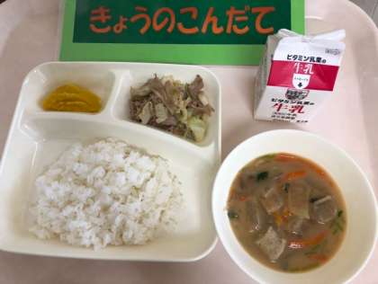 今日の給食は「豚肉とまいたけのいためもの、つみれ汁、かぼちゃういろう、ごはん」です。