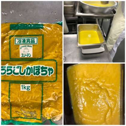 いわしだんごが入ったつみれ汁は、子供達に好評です。デザートにはかぼちゃペーストと上新粉を使い、オーブンで蒸し焼きにしたかぼちゃういろうが登場しました。モチモチとした食感で、ほんのり甘くとても美味しかったです。