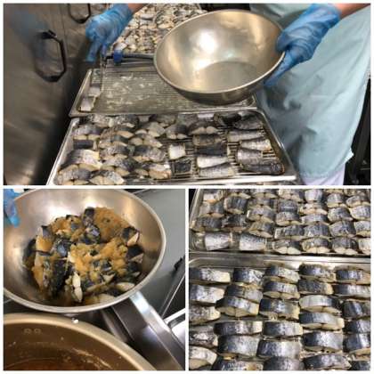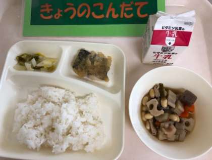 今日の給食は「さごしのおろしじょうゆかけ、五目豆、はくさいの甘酢あえ、ごはん」です。