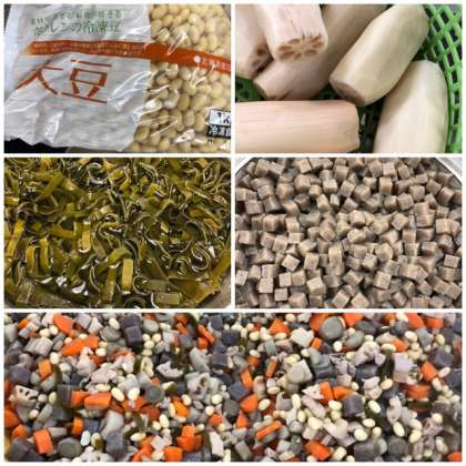 五目豆は大豆煮の他に、鶏肉、こんにゃく、れんこん、ごぼう、にんじん、切昆布といったかみごたえのある食材がたくさん使われています。よく噛んで食べると、食べすぎを防いだり、消化、吸収が良くなる、脳の働きご良くなるなど体に良いことがたくさんあります。