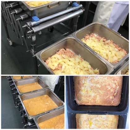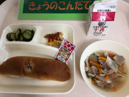 今日の給食は「ツナポテトオムレツ、スープ、きゅうりのバジル風味サラダ、レーズンパン」です。オムレツは、液卵、ツナ、じゃがいもを混ぜ合わせ、オーブンで焼き上げます。