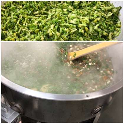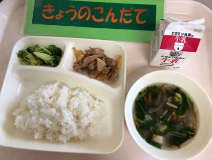 今日の給食は「豚肉のコチジャンいため、もずくスープ、ブロッコリーのナムル風あえもの、ごはん」です。