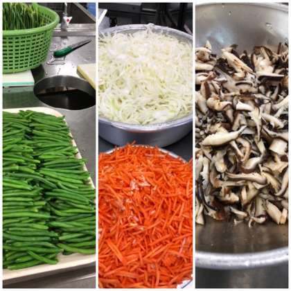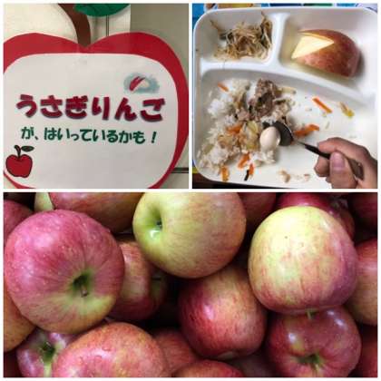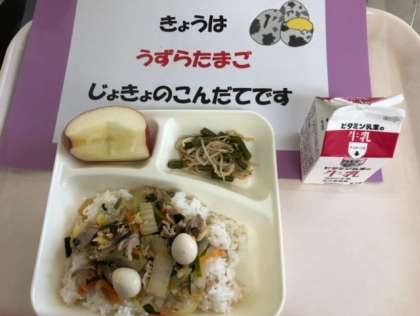 今日の給食は「中華丼、もやしの中華あえ、りんご」です。中華丼は、豚肉、はくさい、玉ねぎ、にんじん、にら、しょうが、しいたけを使用した、子どもたち人気のある丼です。