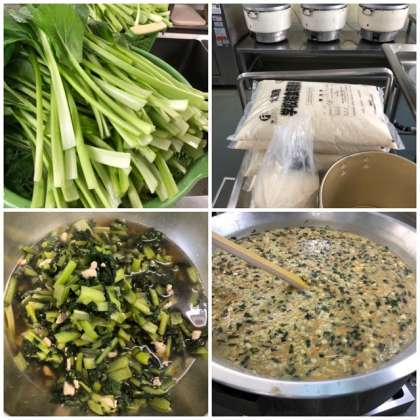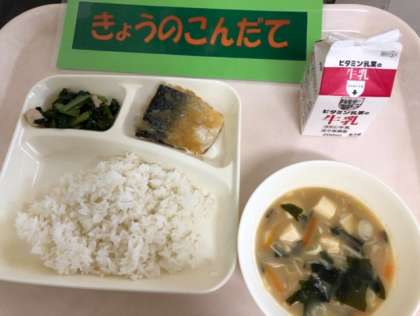今日の給食は「さばのみぞれかけ、みそ汁、こまつなの煮びたし、ごはん」です。