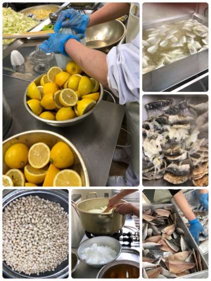 今日の給食は「あじのレモンマリネ、スープ煮、固形チーズ、黒糖パン」です。レモンマリネはから揚げにした「あじ」に、炒めた玉ねぎとレモン果汁などで作ったマリネ液をからませています。レモン果汁は生のレモンを給食室でひとつひとつ絞っています。外国産のレモンは1年中見かけますが、給食では、国産のものを1月と2月の旬の時期のみ使用しています。