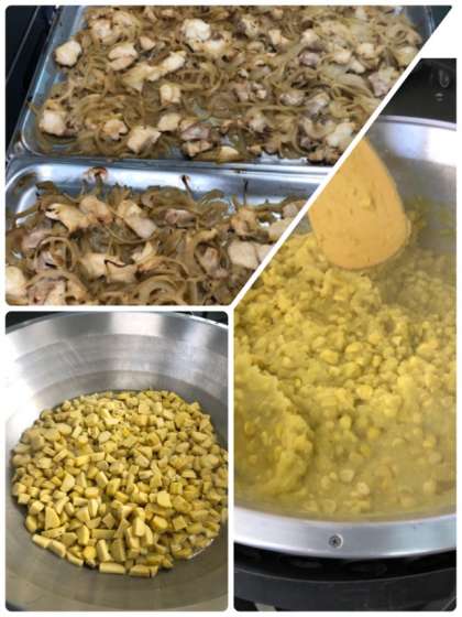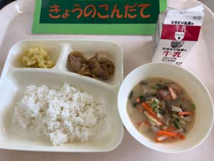 今日の給食は「鶏肉の甘辛焼き、かす汁、くりきんとん、ごはん」です。