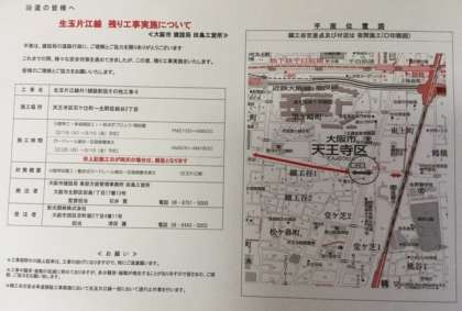 明日2月19日(火)から3月15日(金)の期間で、生玉片江線の残り工事が実施されます。