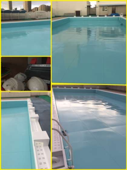 ピカピカです。コースラインや飛び込み台の数字などはこれから塗ります。 水は入っていません。