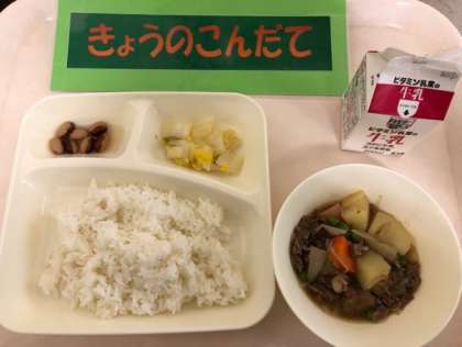 とら豆は、模様が虎に似ていることから、この名前がついています。甘くてほくほくしていますが苦手な子どもたちもちらほら。食物繊維や、鉄が多く含まれているので、子どもたちにはすすんで食べてほしい食材の一つです。