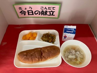 今日の「カレーマカロニグラタン」は小麦粉、牛乳、乳製品を使用していません。米粉を使ったカレールウの素やマカロニ、パン粉を使用しています。