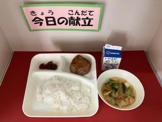 「和風ハンバーグ」は焼いたハンバーグに、とろみのある和風だれをかけました。子どもたちに人気の献立です。