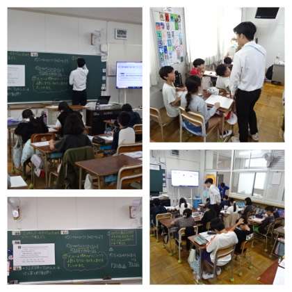 教育実習生の研究授業でした。算数科の『平均』の学習で、「0が入っている場合の平均の求め方について考えよう」という課題に向かって、実習生と子ども達が一緒になって、一生懸命に取り組んでいました。