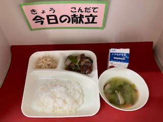 今日の給食は、韓国・朝鮮料理です。プルコギの「プル」は「火」、「コギ」は「肉」という意味で、合わせて「火で焼いた肉」という意味になります。トックの「トッ」は「もち」、「クッ」は「汁」という意味です。韓国・朝鮮のもちと野菜を使ったスープです。