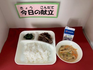 ●牛肉の甘辛焼き ●なめこ汁 ●ほうれんそうのおひたし ●ごはん ●牛乳